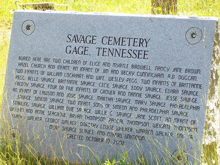 (Copied From Marker at the right) SAVAGE CEMETERY GAGE, TENNESSEE