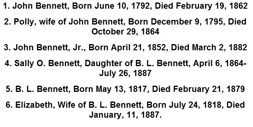Bennett Cemetery Bennett Cemetery is now located on Private Property, please respect the rights and wishes of the property owners. Thank you. Pictures & Survey by Glenda Schroeder, October 11, 2005