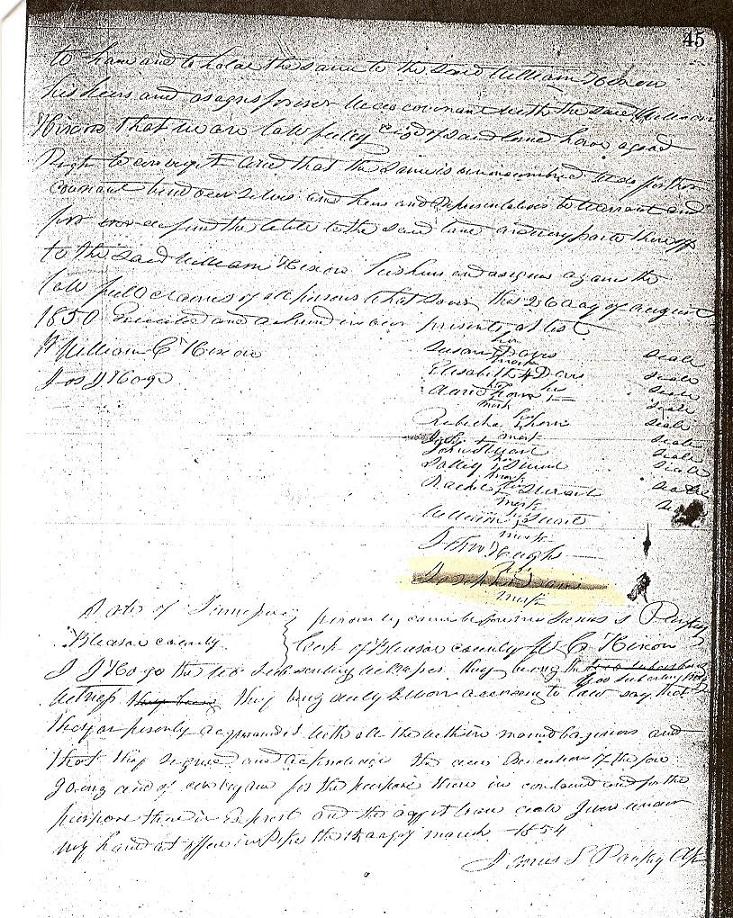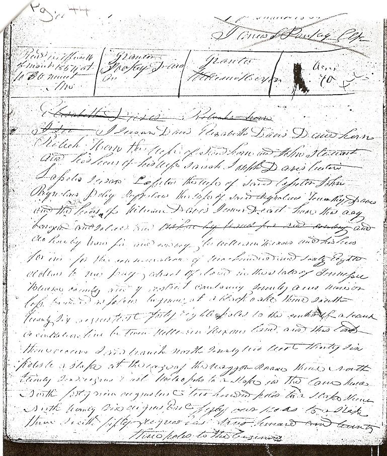 I SUSAN DAVIS, ELIZABETH DAVIS, DAVID HORN, REBECCA HORN, the wife of said Horn and JOHN STEWART & his heirs of his wife SARAH, JOSEPH DAVIS, BURTON LASATER, SUSAN LASATER the wife of said Lasater, JOHN REYNOLDS, POLY REYNOLDS the wife of said Reynolds, TIMOTHY DAVIS & the heirs of WILLIAM DAVIS, --?-- Death, have this day bargained and sold and do hereby transfer and convey to WILLIAM HIXON and his heirs forever for the consideration of $248.00 to us pay a tract of land in the state of Tennessee, Bledsoe County and 9 district containing 70 acres more or less bounded as follows -- Beginning at a black oak then S 28 degrees W 48 poles to the center of a branch a conditional line between WILLIAM HIXON land and this land thence --?-- --?-- --?-- said branch N 72 poles to a stake at the edge of the wagon road thence S 26 degrees E 12 poles to a steak in the line thence N 49 degrees W 200 poles to a stake thence N 26 degrees E 54 poles to a stake thence S 50 degrees E 223 poles to the beginning to have and to hold the same to the said WILLIAM HIXON his heirs and assigns forever --?-- covenant with the said WILLIAM HIXON that was lawfully seized of said land have agreed right to convey --?-- --?-- that the Davis --?-- --?-- for this --?-- --?-- --?-- and --?-- responsibilities to warrant and --?-- --?-- the title to the said land and every part thereof to the said WILLIAM HIXSON his heirs and assigns against lawful claims against lawful claims of all persons whatsoever this 26th day of August 1850.