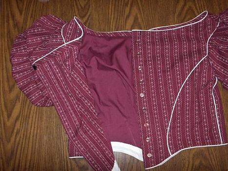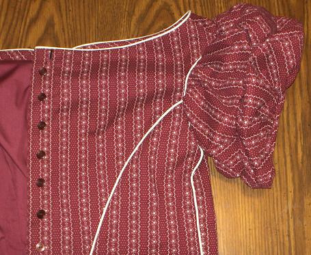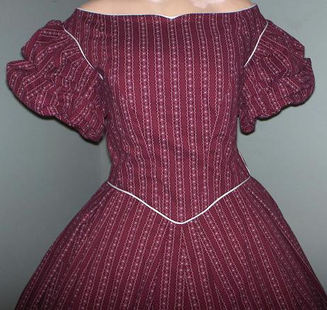 The simple ball/tea gown, bodice lined and boned, Puffed or Flat Sleeve (your choice), button closures in back(not lacing), plain, box-pleated skirt, same/self fabric piping, made with modern day cottons (local stores). Skirt has about 175 inches circumference, designed for a standard 4-boned hoop.
