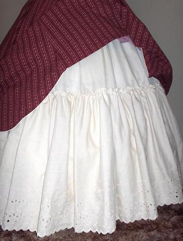 Reproduction Cotton Print Fabric Bidal Satin Ruffle and ribbon bows to outer skirt scallops Using Eyelet for Ruffle Skirt lining Adding Bertha/Collar Adding lace trim Laces in back closure instead of buttons |
