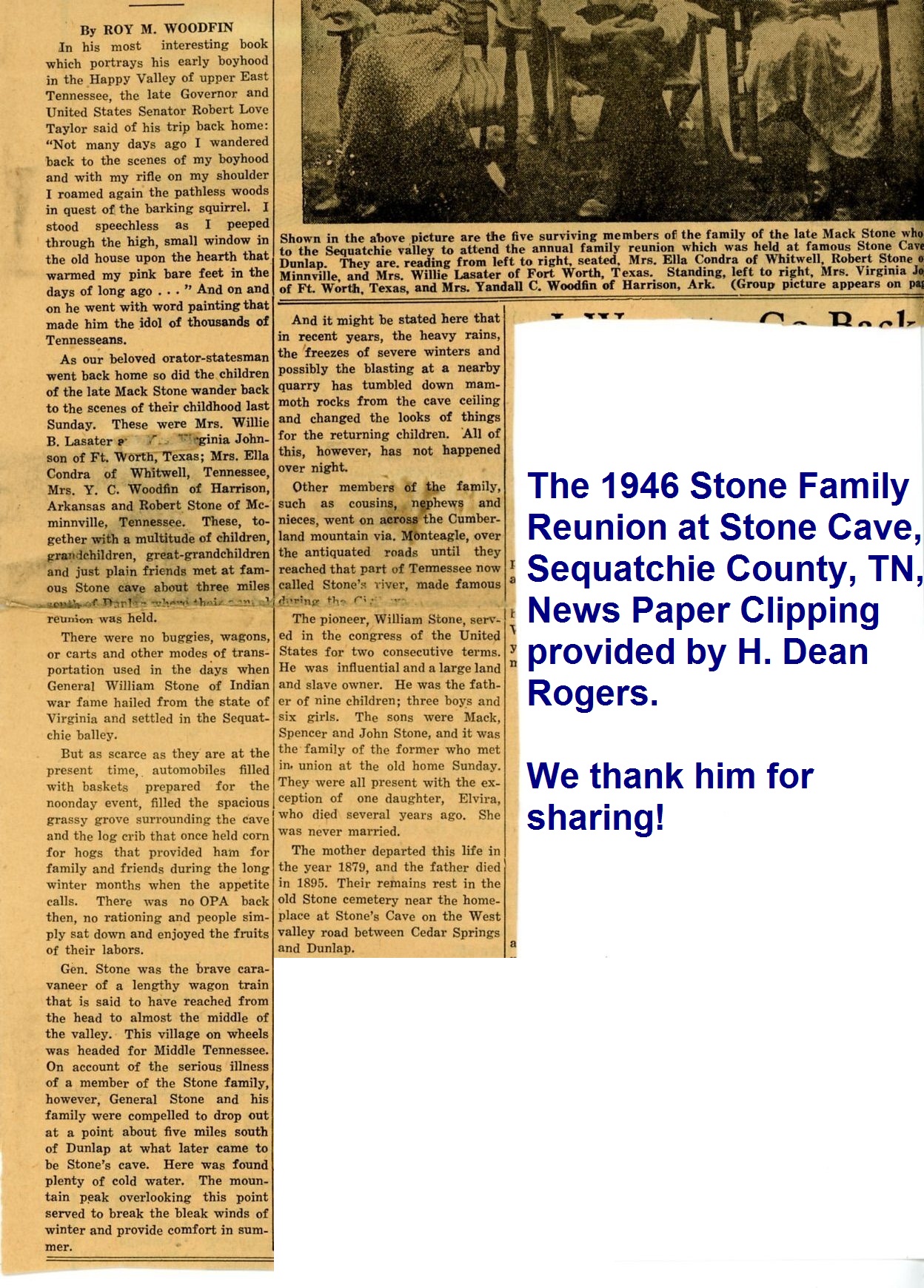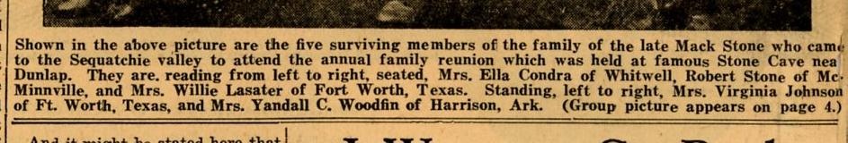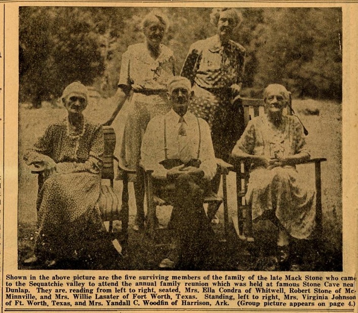 The lady standing on the far right is my Great Grandmother Grace A. Stone Woodfin. I knew her well as a youngster as she stayed with us in Harrison, Arkansas (where I was born) several summers. She was Mack (M.P.D.) and Sallie Stone's youngest daughter. She married into the Woodfin family of which Roy Woodfin belonged. He was the publisher of the South Pittsburg newspaper for many years and actually attended the stone family reunions of which he wrote about in the article I sent. ... Dean Rogers |