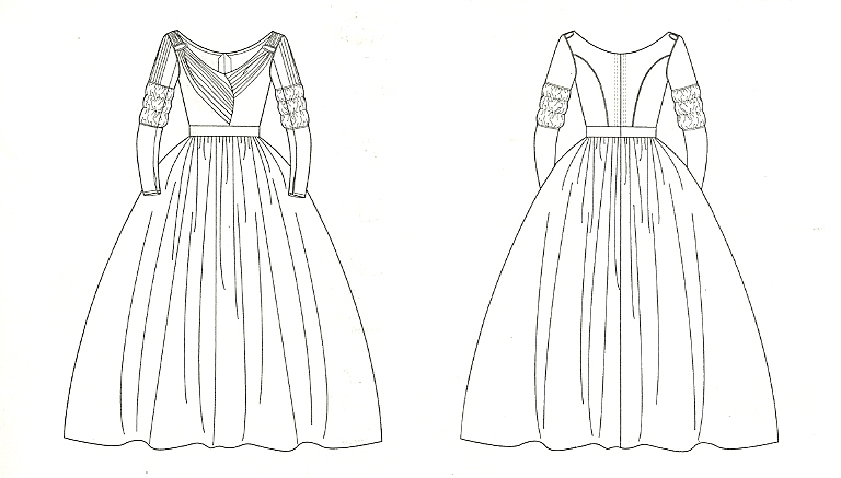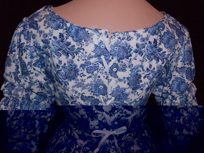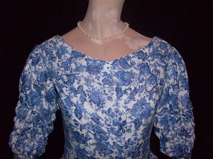 Dress has fitted, lined, boned, bias front bodice with overlapped pleated drape. Gathered skirt, bias gathered sleeves, piping and back hidden button closure. Petticoats not included. Please state if you would like a higher neckline, as this gown has a very scooped/low neckline. Back and front. ... No extra cost, just a choice. |