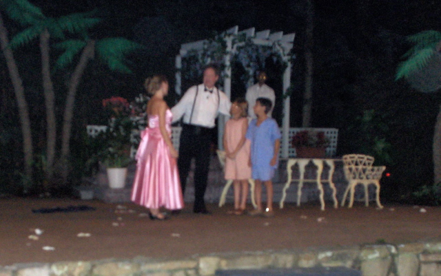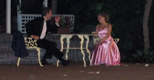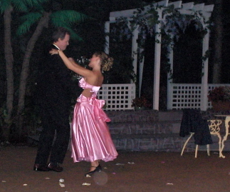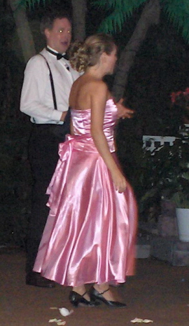 Left: Ensign Nellie Forbush (Shandra Burnett) – Dinner Party Scene: Pink Evening Gown, Pattern, Design and Construction by Glenda Schroeder. Made of Pink Bridal Satin, boned and fully lined bodice, Side zipper closing, netting underslip in/on skirt lining and large bow in back. |