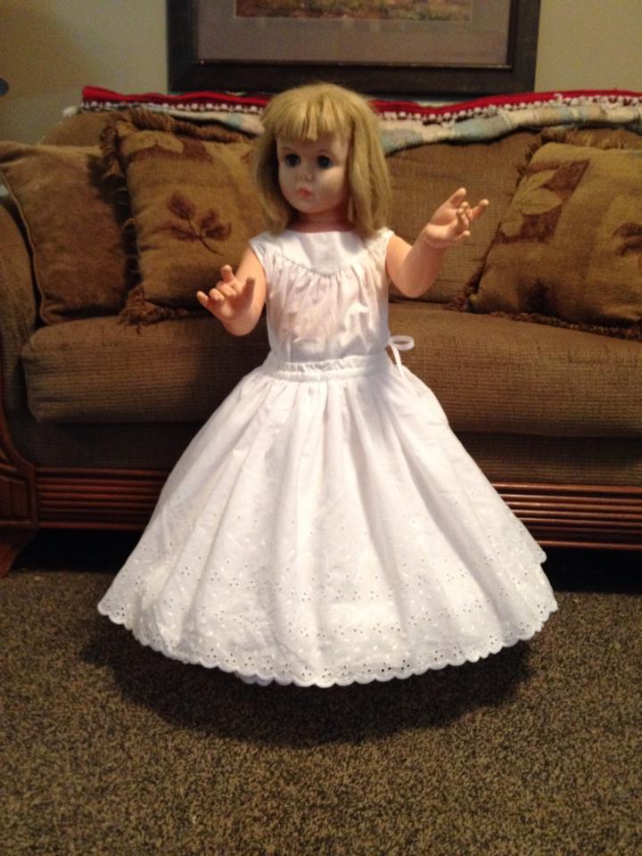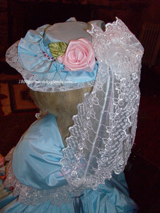 Custom Hoop made for under the gown. Outfit included: Bloomers, Chemise, 2-boned hoop, Dress/Gown and Hat. Lace Gloves and Parasol purchased seperately. |