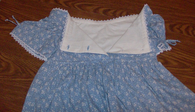 Dress A has a lined bodice with a back closure of buttons, drawstrings are at neckline, sleeves, and waistline, 3 growth tucks in the lower skirt and in lower legs of pantaloons. |