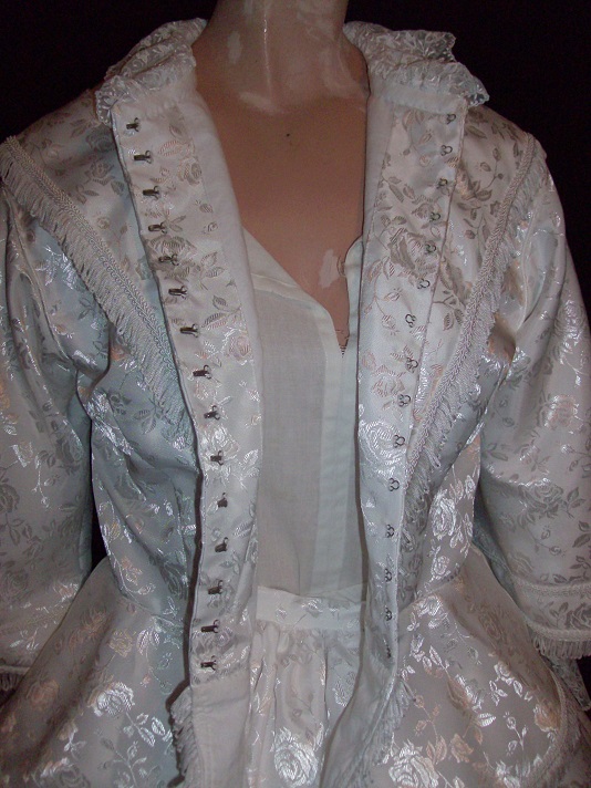 Please check on specialty fabrics... Skirt is designed to be worn over a 4-6 boned hoop. The under-skirt Circumference is up to170 in., depending on fabric width. This labor price is also for the modern gathering style, instead of the hand cartridge pleating. Gown is fully lined, bodice is boned with contrasting collar lace and under sleeves. |
