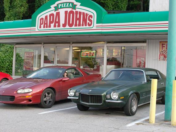 Left Photo - My Camaro is the Green one on the right. The young man in the red Camaro ... we asked him to sit still for the picture because of the newer body style. Papa Johns was giving free pizza to all that drove in with a Camaro in celebration of finding his first Camaro. |