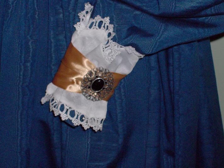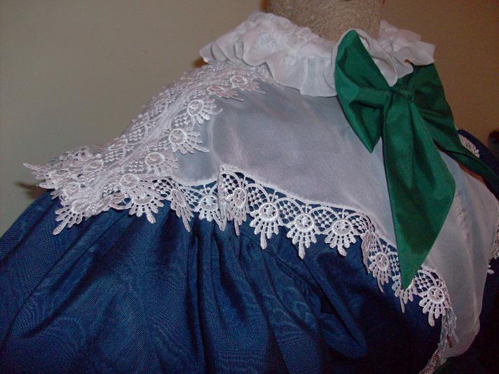 1830’s Dress and Pelerine - Gown inspired and designed from print at the right. Dress/Gown of Blue Taffeta, Pelerine/Fishu Of white chiffon and Venice Lace