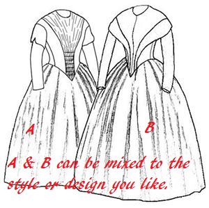 1845-Day Dresses. This style is suitable for the years 1840-1853, and should be worn over a 90 inch circumference corded petticoat or several petticoats rather than a hoop. Pictured is over a 4-boned hoop. View A has a gathered Fan Front bodice, with a fitted lining and a smooth back. View B has a fitted front. (see photo below). Dress is narrow at the waist and widening out to the shoulders. The bodice is fitted in the front with seam from shoulder to front waist, instead of darts. Waistline is slightly lower than the natural waist but can be raised if desired. It also has a side, side back, and back seams for a closer. The waistline sits directly on the waistline, with a deep point in the front. The full skirt is attached to the bodice on the inside of the bodice. The closure is in the center back, with hooks and eyes. The narrow 2-piece sleeve can also be headed with an optional sleeve cap. Please Let me know if you are planning on using a 4-boned hoop. Pricing depends on your custom choices. |